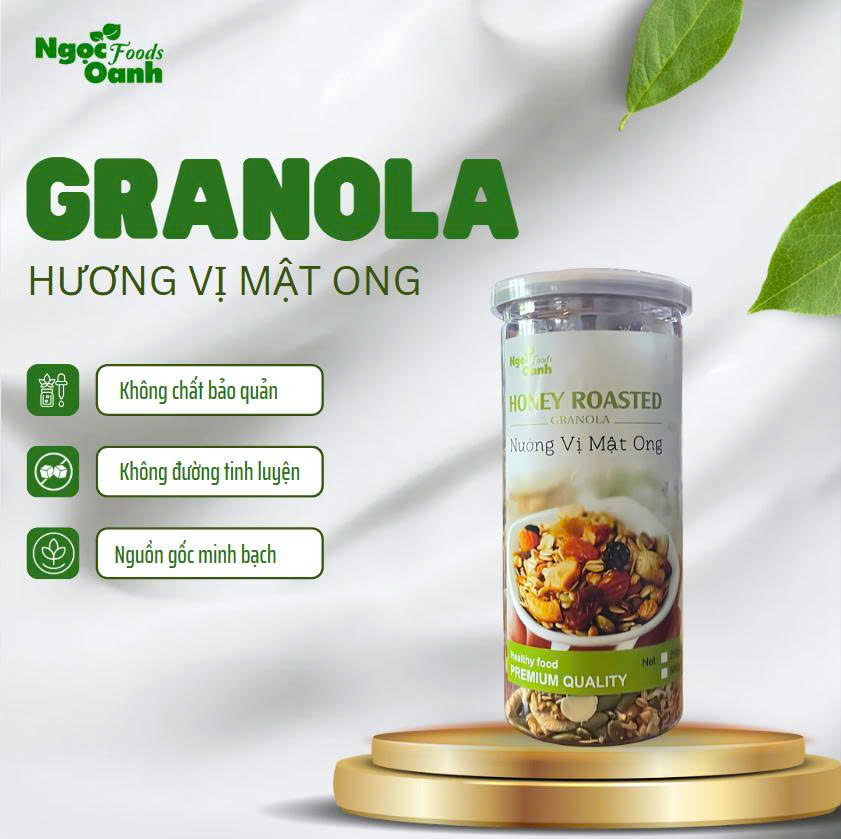 Bạn đang tìm kiếm một bữa sáng nhanh gọn, bổ dưỡng và thơm ngon? Granola Mật Ong của Ngọc Oanh Foods chính là câu trả lời hoàn hảo! Với sự kết hợp giữa các loại hạt dinh dưỡng và mật ong nguyên chất, mỗi muỗng granola sẽ mang đến cho bạn một trải nghiệm ẩm thực tuyệt vời và cung cấp năng lượng dồi dào cho cả ngày dài. Granola Mật Ong được chế biến từ những nguyên liệu tự nhiên, chọn lọc kỹ càng như hạt điều rang giòn, macca béo ngậy, hạnh nhân thơm bùi, hạt bí xanh giàu vitamin, hạt hướng dương bổ dưỡng, óc chó vàng/đỏ tăng cường trí não, dừa sấy thơm ngon, nho khô ngọt thanh và xoài sấy chua ngọt. Nếu khách nào không thích ăn yến mạch thì bên em cũng có sản phẩm siêu hạt cho khách yêu lựa chọn luôn ạ ➖➖➖➖➖➖➖➖➖➖